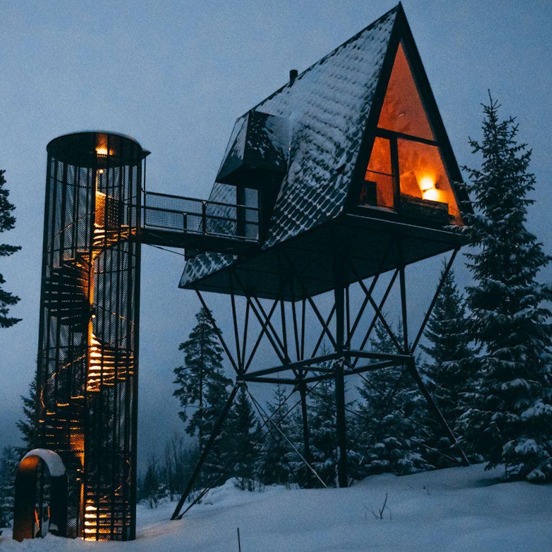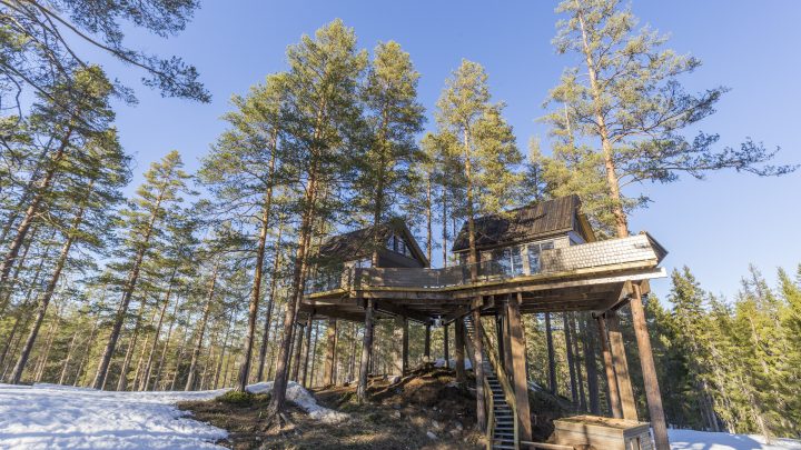 Oppe blant trekronene i furuskogen, omtrent 4-5 meter over bakken, ligger en liten, men sjarmerende arkitekttegnet hytte som fungerer som et hotellrom.